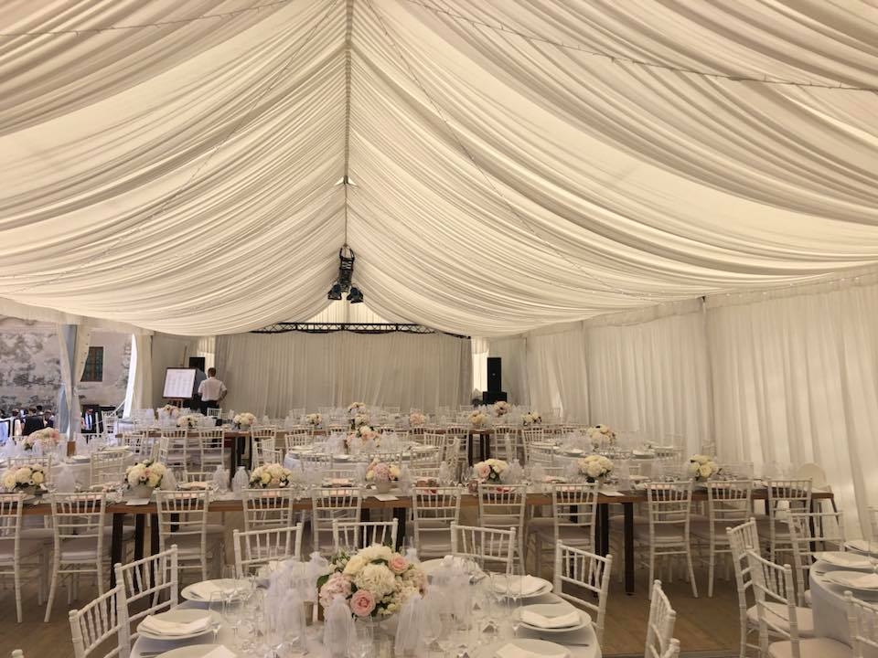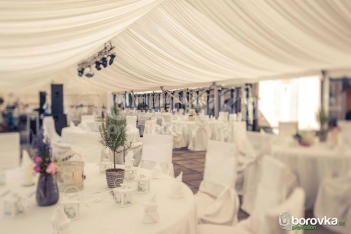 Would you like to make your guests feel like they are in a castle? We can cover the entire tent with canopy drapery. Together with the flooring it is of TOP quality, so your dream of perfect design becomes a reality now.